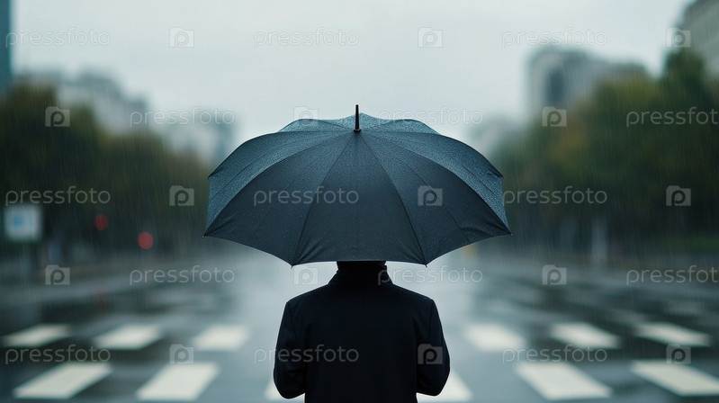 Одинокая фигура тихо стоит под большим зонтом на пустынной мокрой улице в мрачный и дождливый день