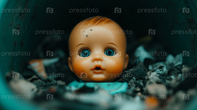 Странное и тревожное изображение заброшенной куклы, уложенной в мешок для мусора, вызывая ностальгию и беспокойство