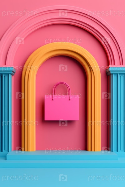 Яркий розовый шопинг Мешок заметно отображается на фоне яркого синего и желтого фона для визуальной привлекательности