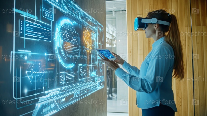 Клиент наблюдает, как технология захватывает устройство дополненной реальности, пространство яркое,