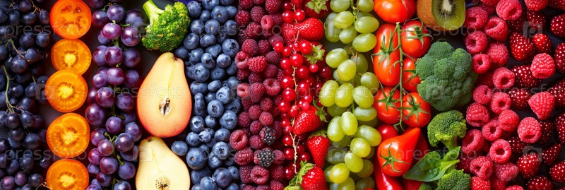Яркая палитра красочных фруктов, ягод и овощей