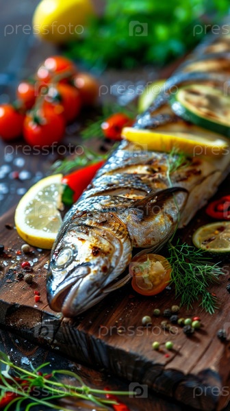 Заречная рыба со свежими овощами, специями, травами и лимоном на гриле