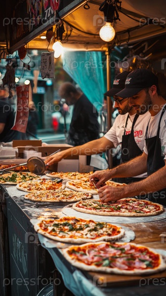Повара-эксперты готовят вкусные пиццы на оживленном продовольственном рынке, повышая общий опыт ужина