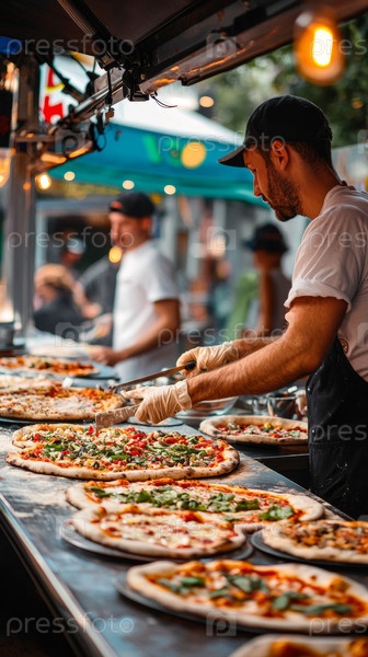 Пицца ремесленника Производителей можно найти на оживленном уличном продовольственном рынке, демонстрируя их вкусные кулинарные творения