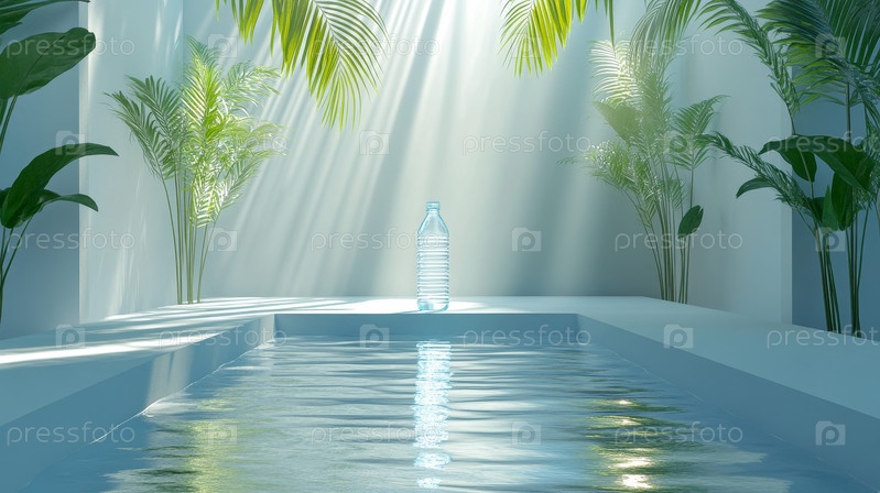 Освежающая бутылка с водой в пышной зелени, все под теплыми объятиями яркого солнечного света