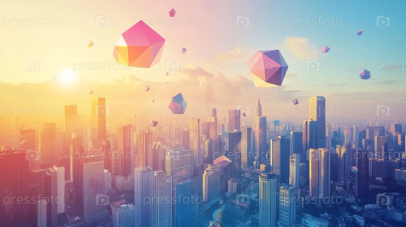 Потрясающий вид на футуристический городской горизонт, украшенный плавающими геометрическими фигурами, освещенный на закате