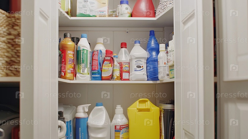 Яркий полк чистящих средств, демонстрирующий широкий спектр различных детергентов и чистящих средств для домашнего использования