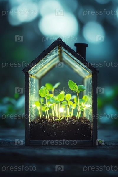 Крошечная теплица мягко светится тепло, демонстрируя яркую новую жизнь, расположенную в темной, очаровательной лесной обстановке