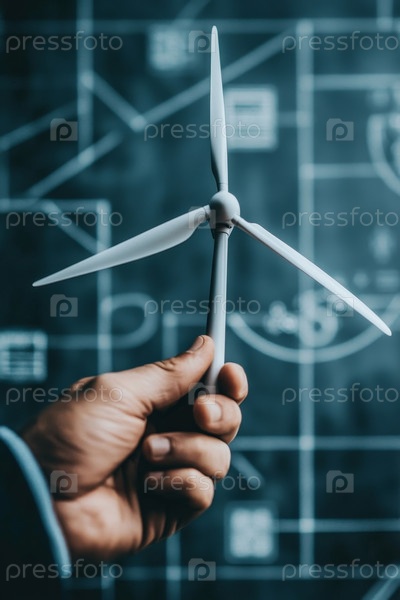 Профессионал внимательно изучает детальную модель ветряной турбины в современной высокотехнологичной среде
