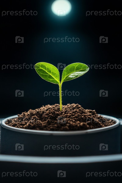 Яркий саженец появляется из богатой почвы в прозрачной чашке, символизирующей рост и обновление в природе