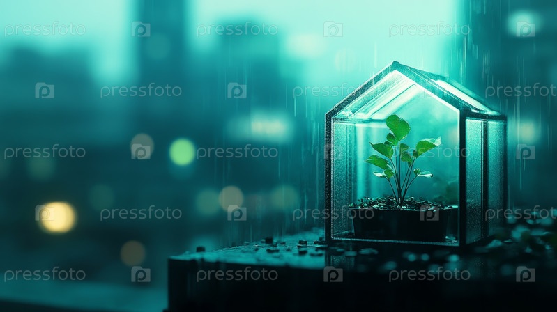Безмятежная и спокойная теплица, демонстрирующая яркое растение, расположенное на фоне дождливого города неподалеку