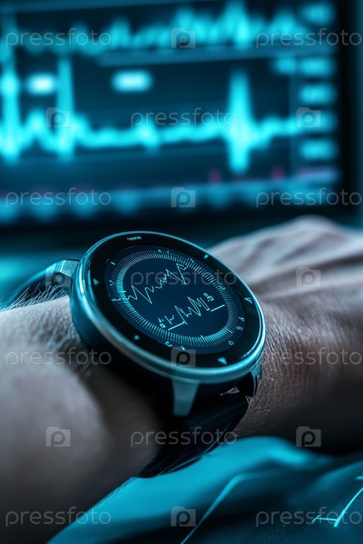 Вид крупным планом руки, украшенной устройством для отслеживания здоровья, демонстрирующим данные ЭКГ, отображаемые на экране