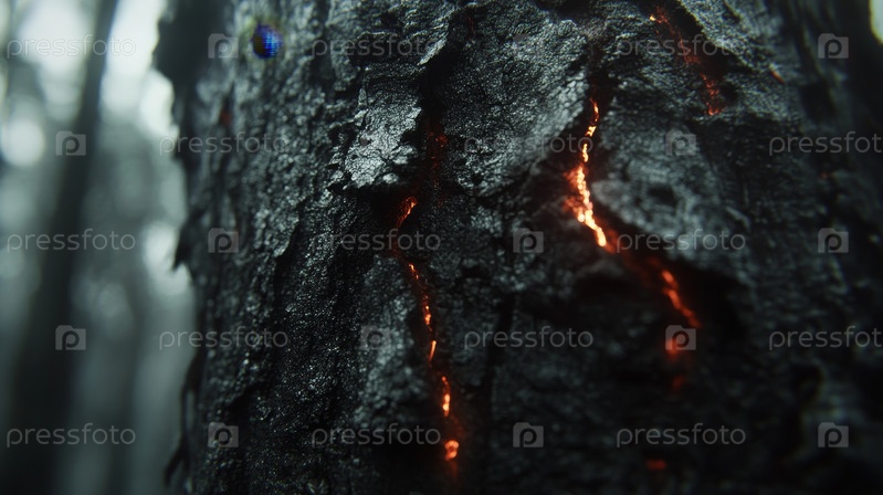 Вид крупным планом обугленной коры дерева со светящимися угли можно увидеть, изображая последствия лесного пожара