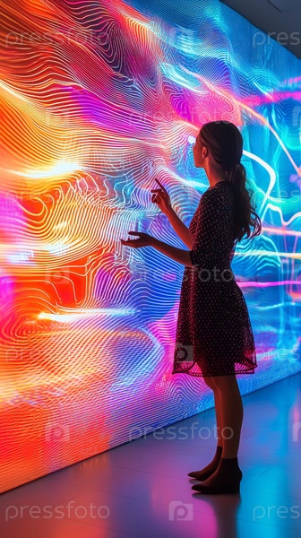 Любопытный посетитель с трепетом смотрит на потрясающие и завораживающие световые узоры в инновационном арт-пространстве