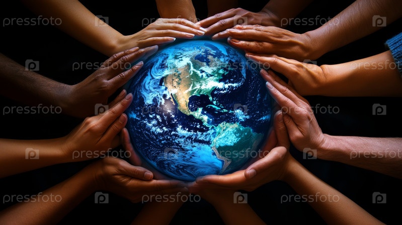Художественные руки изящно достигают яркой, светящейся Земли внизу, символизирующей единство и надежду для всего человечества