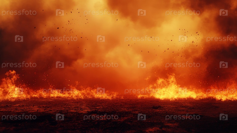 Интенсивная сцена лесного пожара, ярко изображающая ревущие пламя и густой дым, охвативший пустынный пейзаж