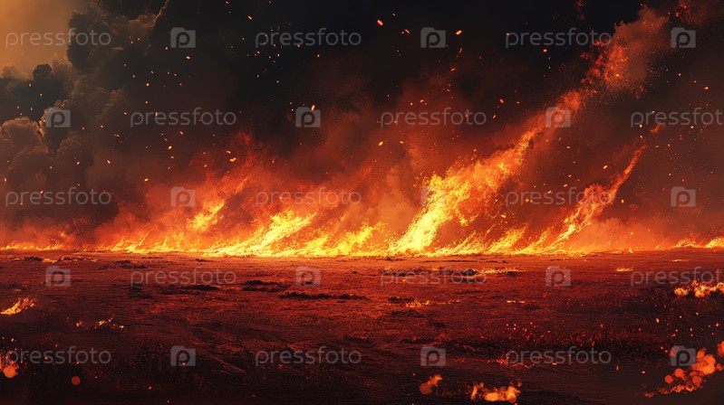 Интенсивная сцена лесного пожара, ярко изображающая ревущие пламя и густой дым, охвативший пустынный пейзаж