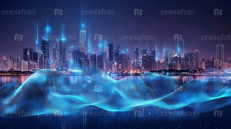 Захватывающий футуристический городской пейзаж изображается ночью с великолепным наложением цифровой волны в небе