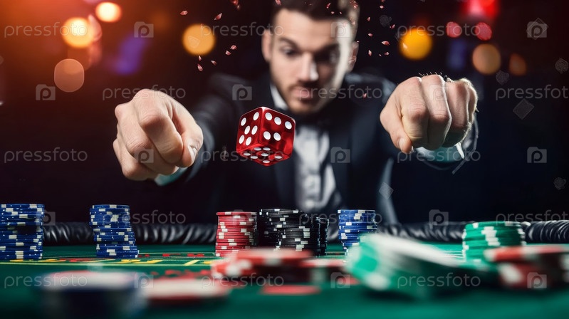 Мужчина интенсивно сосредотачивается на своей игре в кости за ярким столом казино, окруженным игровым волнением