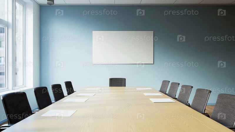 Современный конференц-зал, демонстрирующий просторный деревянный стол в сочетании с элегантными гладкими черными стульями для комфорта