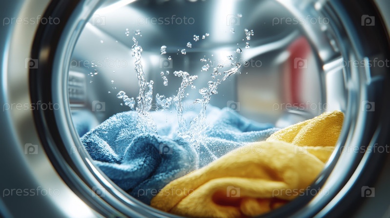 Вот подробный вид, демонстрирующий барабан стиральной машины, который заполнен мыльной водой и мягким синим полотенцем