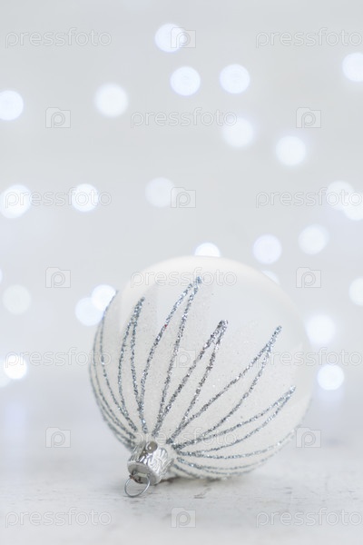 Рождественская сцена с одним белым и серебряным шаром и рождественскими огнями боке на заднем плане