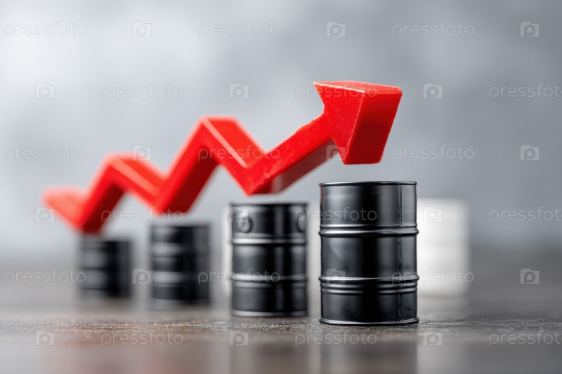 Рост цен на нефть с баррелями и красной стрелкой, представляющей волатильность энергетического рынка, влияние на экономику и инфляцию топлива