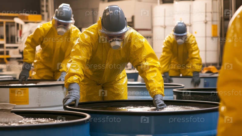 Промышленные рабочие в защитных костюмах тщательно управляют опасными материалами в контролируемой среде