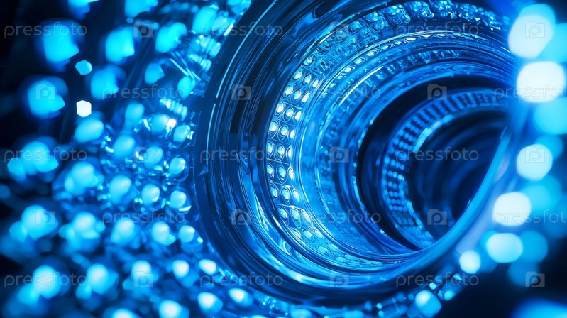 Поразительно красивая промышленная установка с голубым светом, демонстрирующая возвышающиеся охлаждающие конструкции и объекты внутри