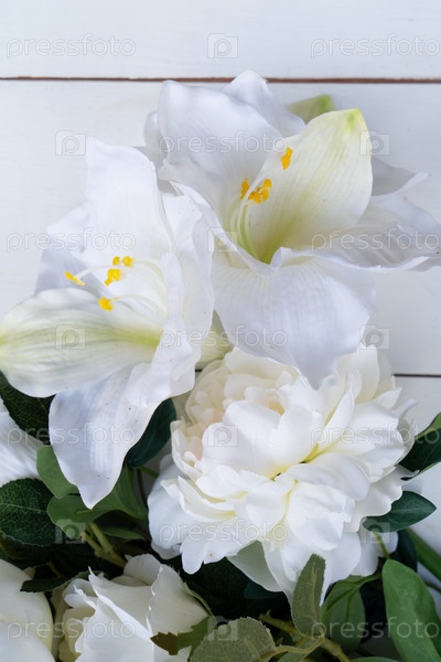 Белые цветы на белом деревянном фоне, нежные розы в стиле камелии с глянцевыми зелеными листьями, устроенными для деревенского свадебного стиля, мягкого естественного света, горизонтального
