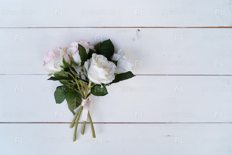 Белый и румяный букет, связанный атласной лентой на деревенских деревянных досках, размещение свадебного стилиста для свадебной редакционной и подарочной вдохновения, мягкий естественный свет,