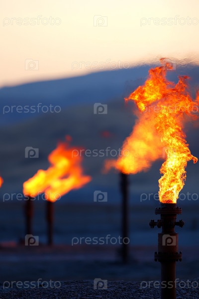Длинная линия пылающих газовых вспышек, горящих по всему промышленному ландшафту в сумерках, ярко-оранжевые пламя и дымовые шлейфы, поднимающиеся из серии факелов, мутные