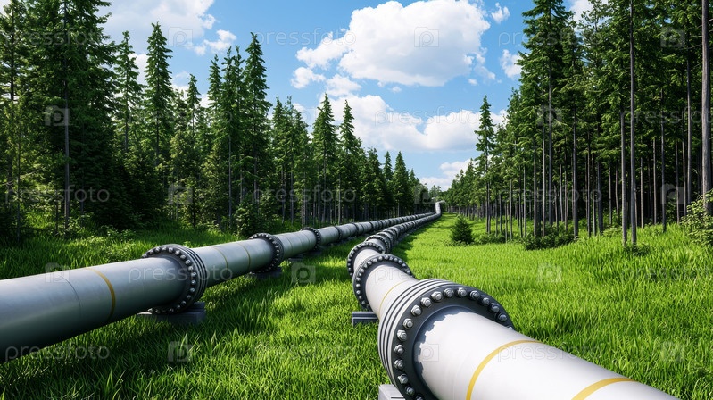 Обширные трубопроводы проходят через яркий и пышный зеленый лес, покоящийся под ясным и ярко-синим небом