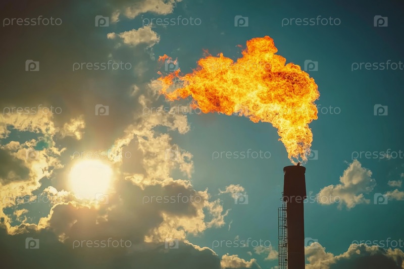 Яркое и интенсивное пламя извергается из нефтяной скважины, на фоне красивого драматического неба в сумерках во время заката