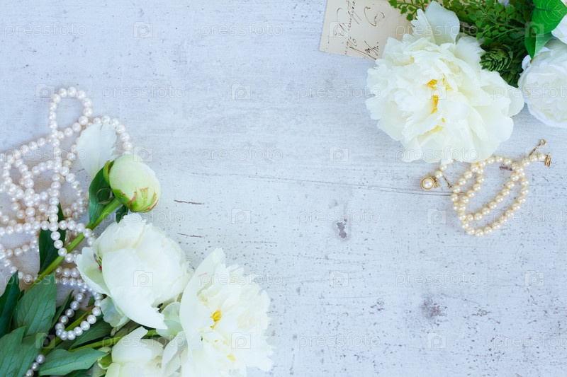 Белые свежие цветы пиона и почки с жемчужными украшениями на старом белом деревянном столе с копировальным пространством