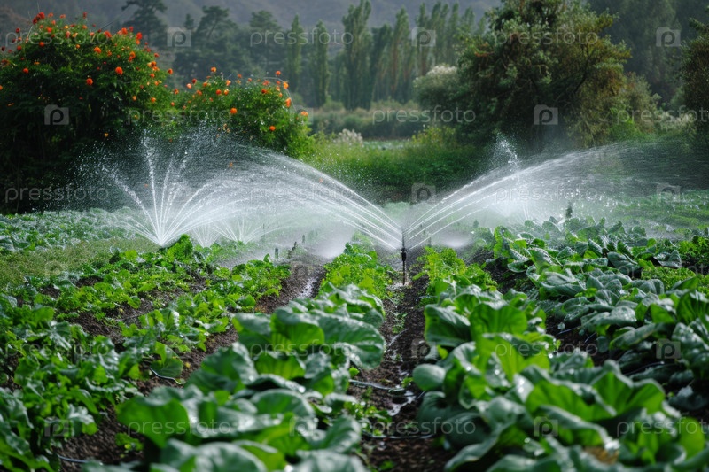 Огромное и пышное зеленое поле салата, демонстрирующее ирригационную систему, активно работающую для питания сельскохозяйственных культур