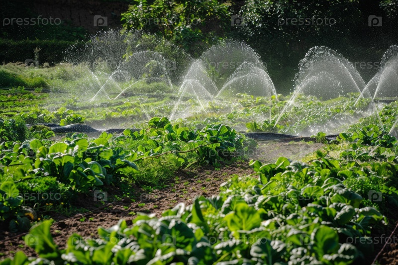 Огромное и пышное зеленое поле салата, демонстрирующее ирригационную систему, активно работающую для питания сельскохозяйственных культур