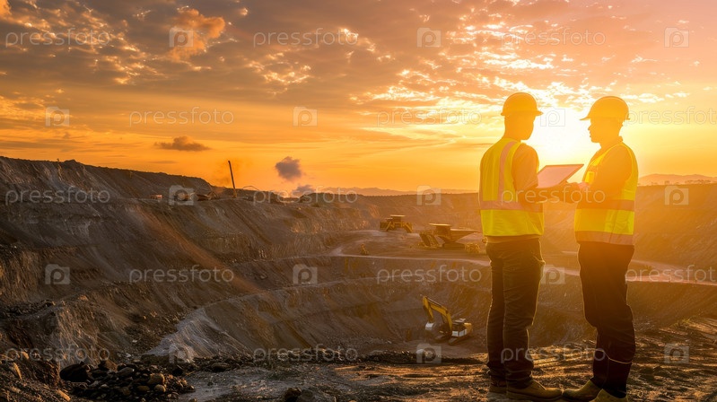 Когда солнце садится, два специалиста пересматривают свои планы по добыче полезных ископаемых, подчеркивая командную работу и безопасность в окружающей среде