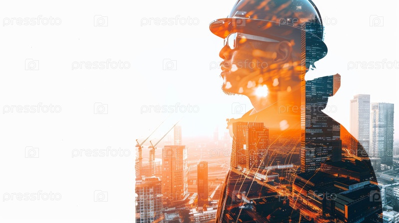 Строитель уверенно стоит на фоне, наполненном потрясающими цифровыми городскими пейзажами и проектами