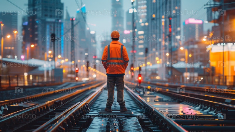 Строитель стоит один на железнодорожных путях во время яркого заката в ярком, шумном городском пейзаже
