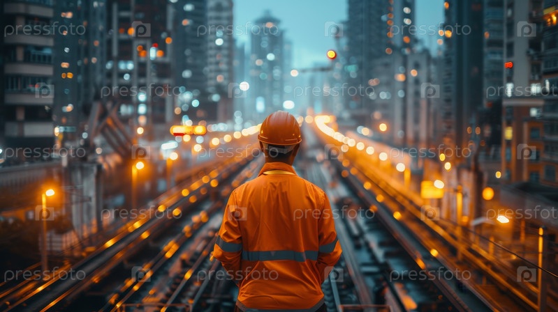 Строитель стоит один на железнодорожных путях во время яркого заката в ярком, шумном городском пейзаже