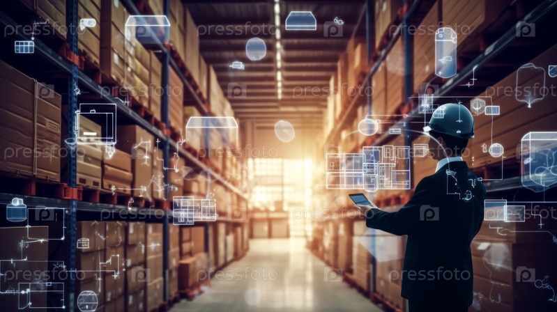 Рабочий взаимодействует с AR-технологией в современной складской среде, демонстрируя передовые решения для инвентаризации