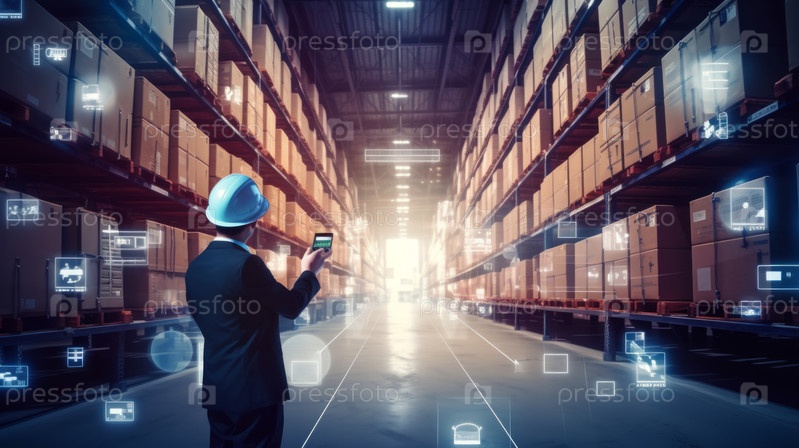 Рабочий взаимодействует с AR-технологией в современной складской среде, демонстрируя передовые решения для инвентаризации