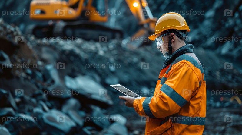 Строитель использует цифровой планшет на месте, планирование и мониторинг прогресса с экскаватором в фоновом режиме