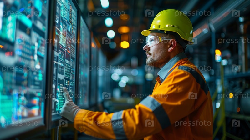 Женщина-инженер анализирует данные на экранах компьютеров в передовой промышленной диспетчерской с защитным снаряжением