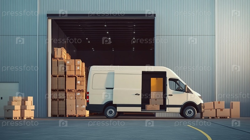 Доставочный фургон, загруженный картонными коробками, стоит за пределами склада логистики с открытой дверью,