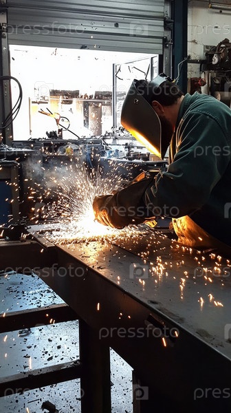 Опытный сварщик, активно используя сварочный инструмент, создает яркие искры в оживленной металлической среде мастерской