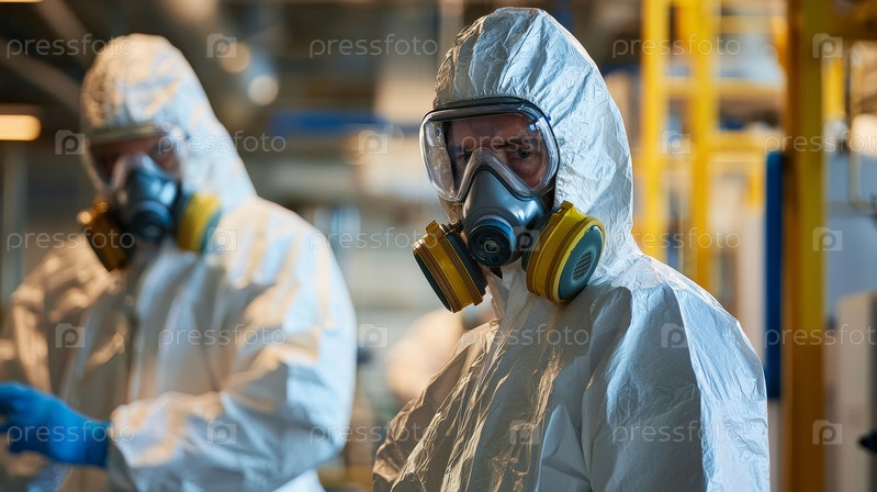 Работники в желтых защитных костюмах тщательно контролируют опасный промышленный объект с выбросами пара и газа
