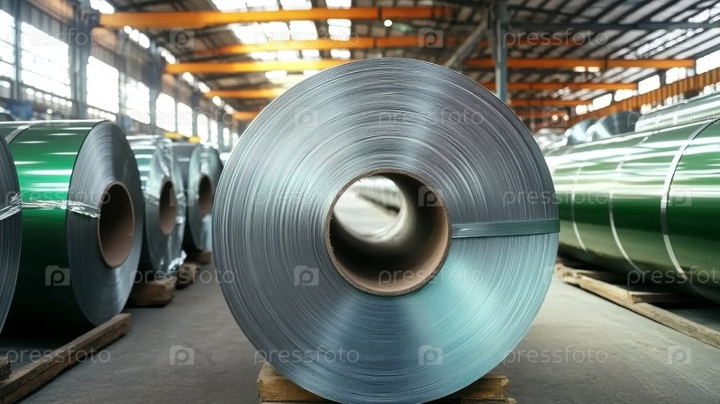 Вид крупным планом аккуратно организованных стальных катушек, расположенных на просторном складе, все готово к предстоящему производству