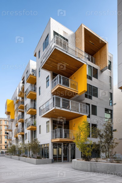Солнечные модульные квартиры с деревянными балконами, показывающие консольные коробки, бетонный фасад, плантационные коробки и стеклянные перила, теплые текстуры древесины, мягкие